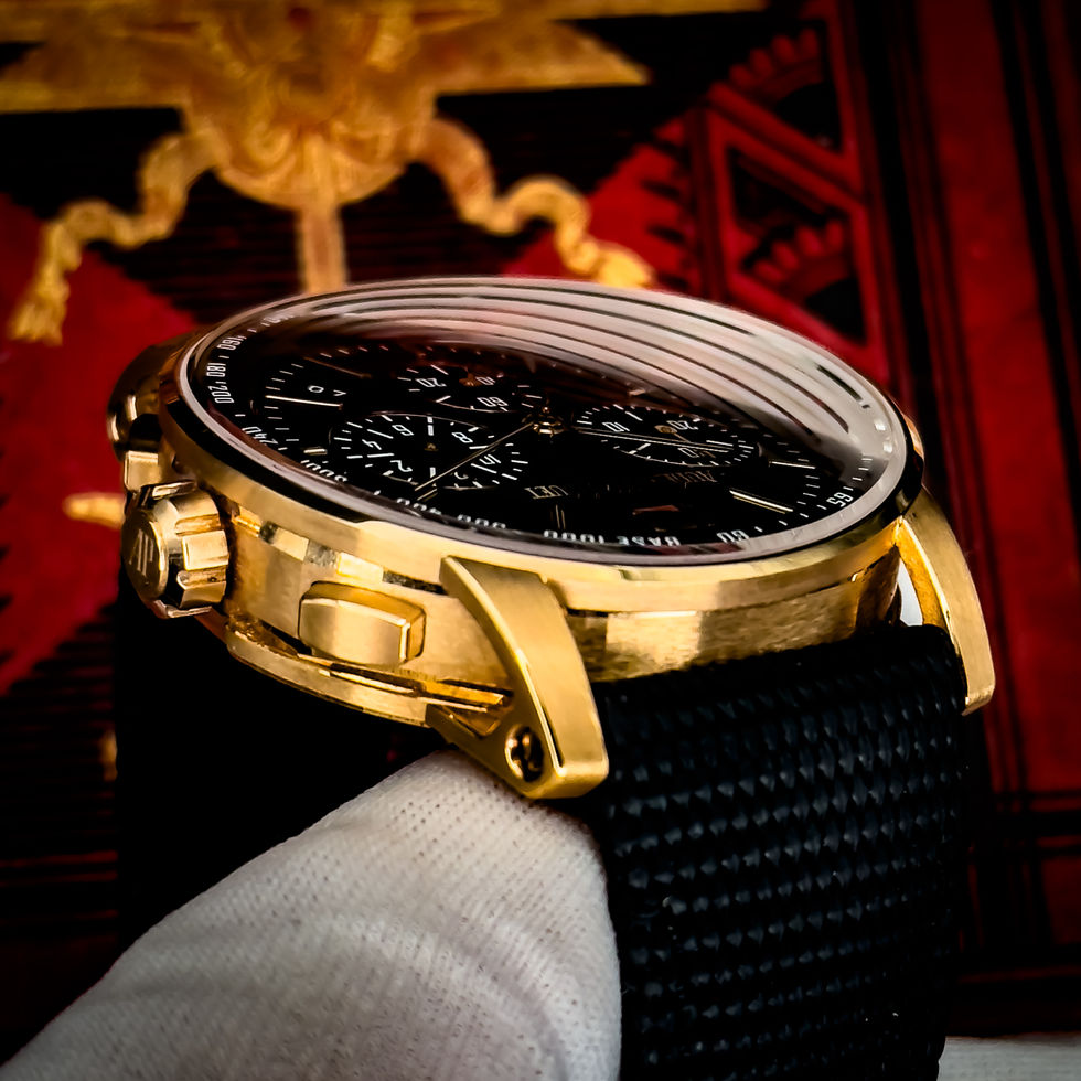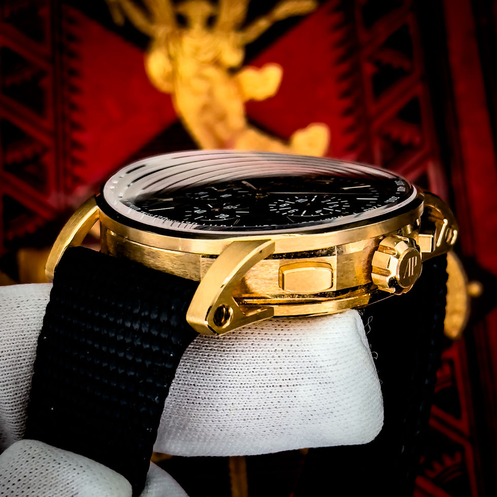 The Audemars Piguet Code 11.59 26393OR.OO.A002KB.01 is one of those pieces that feels understated at first glance, but the more time you spend with it, the more you realize how much detail is packed in. Crafted in 18k pink gold with a beautifully sculpted 41mm case, it leans refined and architectural, with its sleek black dial and matching chronograph registers giving it a clean, dressy edge. One of the standout features is the crystal—AP uses a double-curved sapphire that’s domed internally and vertically curved across the surface, creating a subtle distortion effect that gives the dial incredible depth and constantly changing angles in the light. Inside, it’s powered by the in-house Caliber 4401, an automatic flyback chronograph with a column wheel, 70-hour power reserve, and exhibition caseback. It’s a really sharp blend of elegance, technical substance, and everyday wearability—perfect for someone who wants something more under the radar but still undeniably special.