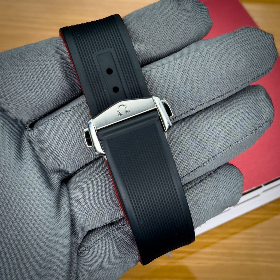 The matt black ceramic unidirectional rotating bezel has a polished diving scale whose indications have been created in relief using laser ablation. The watch is presented on a rubber strap and it is equiped with the OMEGA Co-Axial calibre 3330.