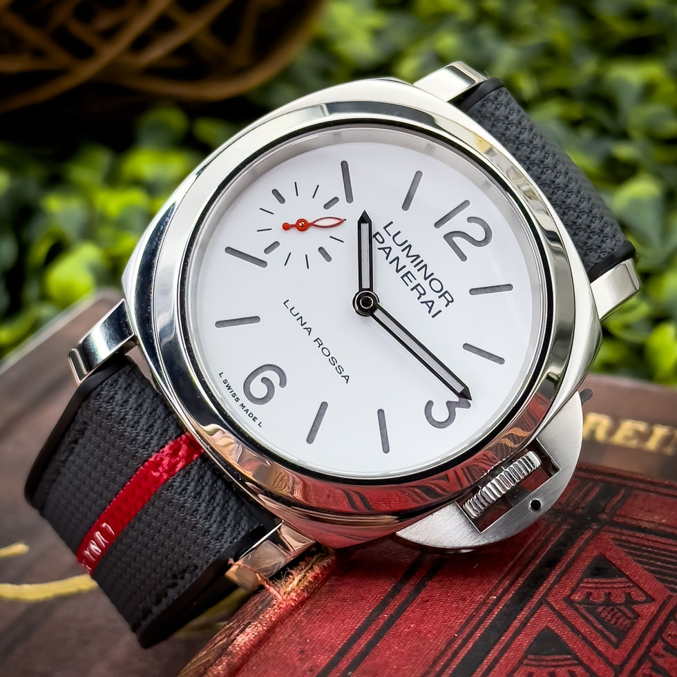 Panerai Luminor Luna Rossa PAM1342 – Embrace the spirit of high-seas adventure with the PAM1342, a tribute to Panerai’s partnership with the Luna Rossa Prada Pirelli sailing team. This 44mm polished stainless steel timepiece features a crisp white dial adorned with luminous gray Arabic numerals and hour markers, ensuring optimal readability. A striking red small seconds hand at 9 o’clock adds a bold touch, reflecting the dynamic essence of the Luna Rossa team. Powered by the hand-wound P.6000 calibre, it offers a robust 3-day power reserve. The watch is complemented by a gray bi-material strap with a distinctive red stripe and Luna Rossa logo, embodying nautical elegance and performance.