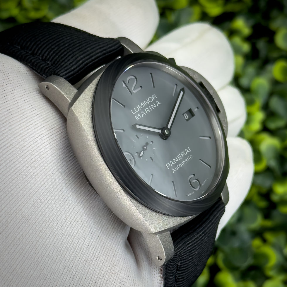 The Panerai Luminor Marina PAM01662 “TuttoGrigio” is a modern, stealthy take on the classic Panerai tool-watch look. It features a 44mm titanium Luminor case with the signature crown-guard, paired with a Carbotech bezel and an anthracite/grey dial with bold luminous markers, date at 3 o’clock, and small seconds at 9. Inside is Panerai’s in-house P.9010 automatic movement with a 3-day power reserve, and it’s built to be worn like a true sports watch with 300m water resistance. Clean, rugged, and unmistakably Panerai — this one stands out for its all-grey “ghost” aesthetic while still keeping the iconic Luminor presence.